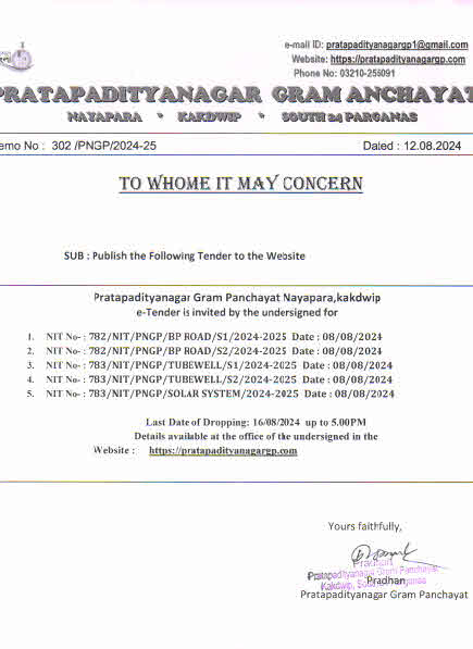We welcome you to the official website of Pratapadityanagar Gram Panchayat who is the pioneer Gram Panchayat of South 24 Parganas District to launch its own website. A visit through this site will provide the visitor a complete outlook about our Gram Panchayat.